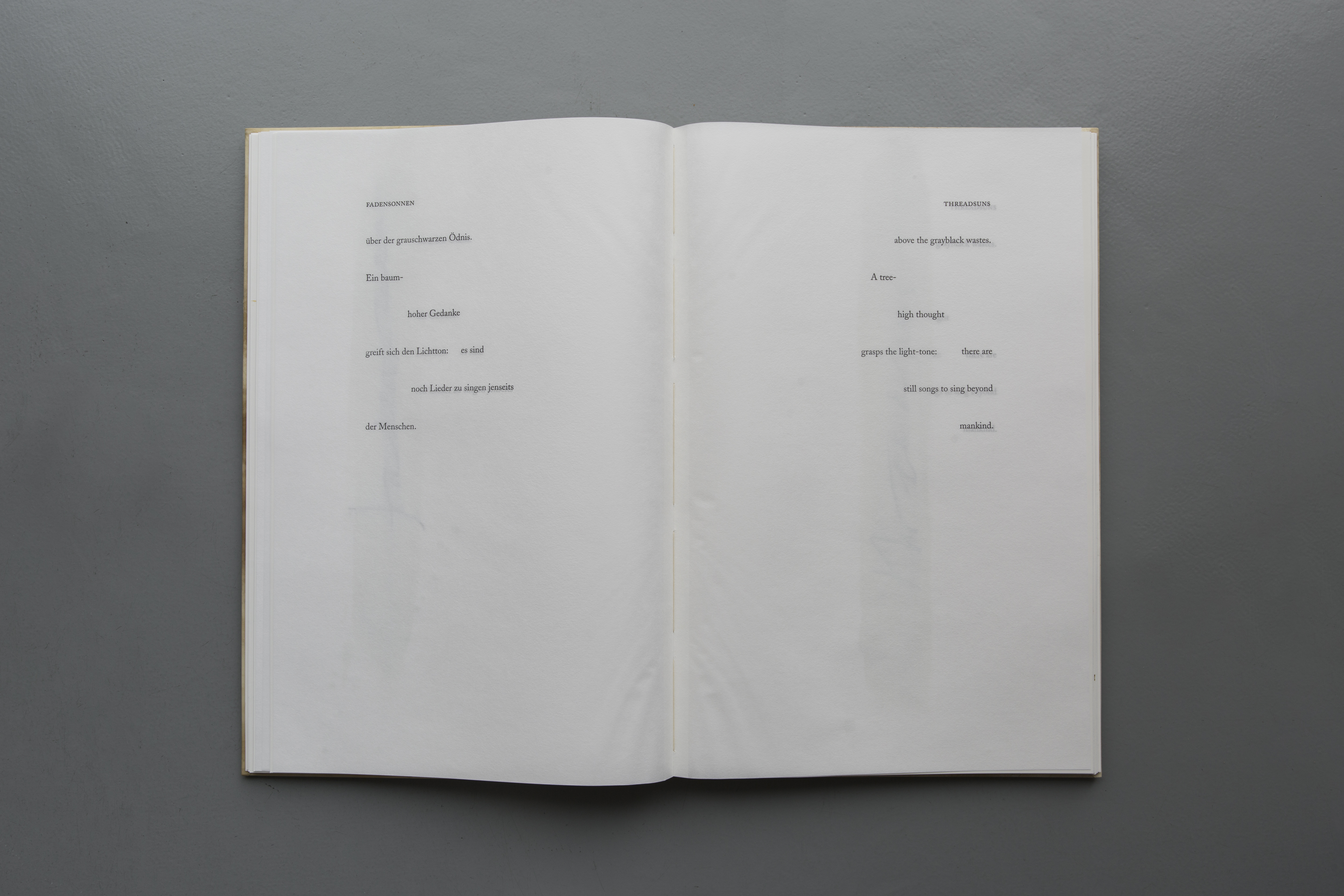 The white page is a space for pausing, with scattered words as if caught in a moment of suspended breathing. Van de Graaf’s canon, commonly used in medieval book design — including Gutemberg’s Bible (1455) — provides the structure behind the text layout. Poems in German and their English translation face each other across the double spread: an allusion to the forced migration from East to West suffered by Celan’s family. The analogous journeys of both paper and porcelain are reflected in the choice of papers of Japanese, English and German origins. The text was set in Adobe Caslon and letterpress-printed. Once bound, the pages were approached as canvases by the artist, who intervened directly over the printed paper with kaolin, pencil and gold leaf.