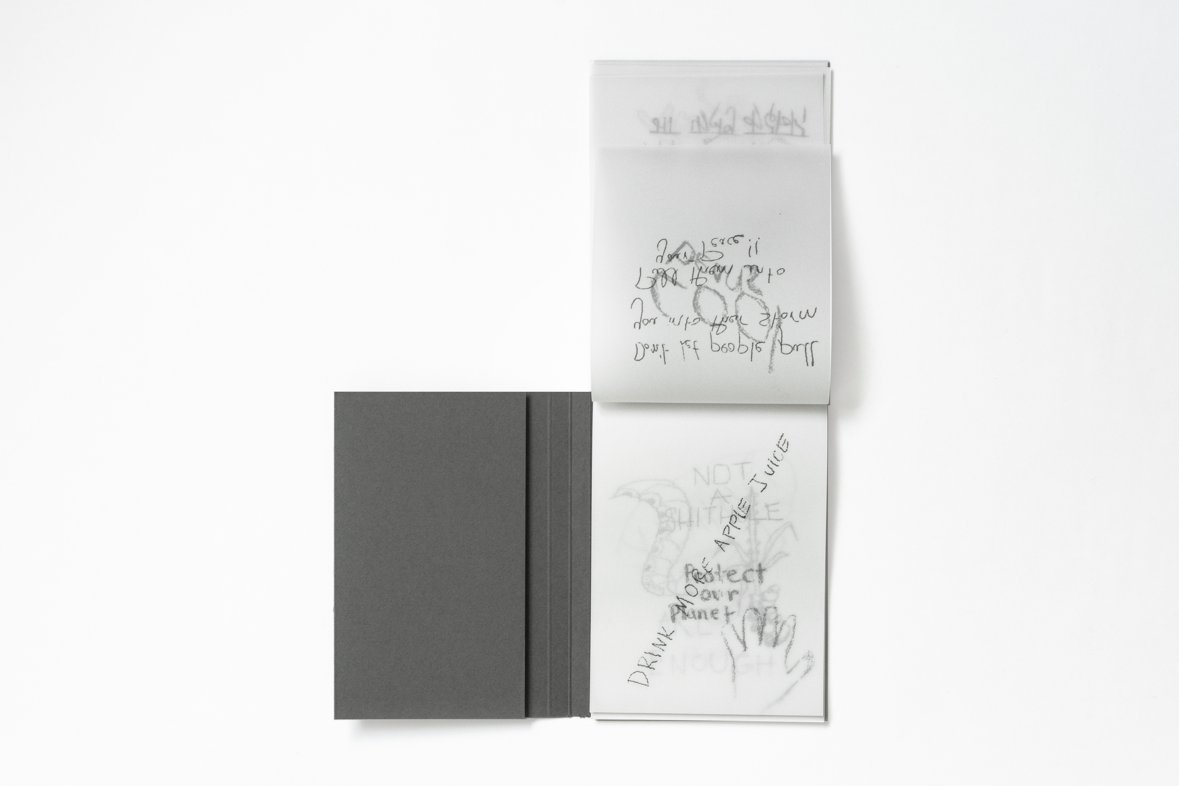 These messages are a response to the invitation offered up by the artist’s installation. They were printed on translucent paper, which emulates the surprising dialogue that stemmed from the overlapping of writings on the gallery wall. Reading like a flip-book, the stories cross in superposed read-through layers. The book also includes a conversation between Wangechi Mutu and Ruth Erickson, the exhibition’s curator, that reflects on the communicative act in the space of a museum.